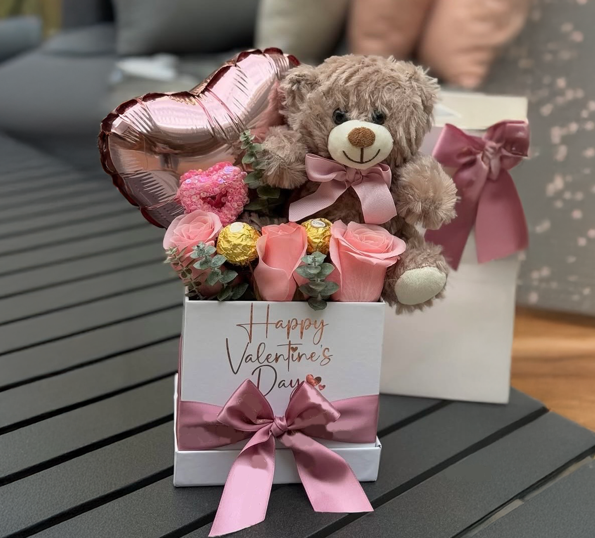 Nuestra canasta más popular, que incluye una combinación de rosas frescas, un osito de peluche suave y Ferrero Rocher, todo en una canasta blanca o negra con un tema personalizado.