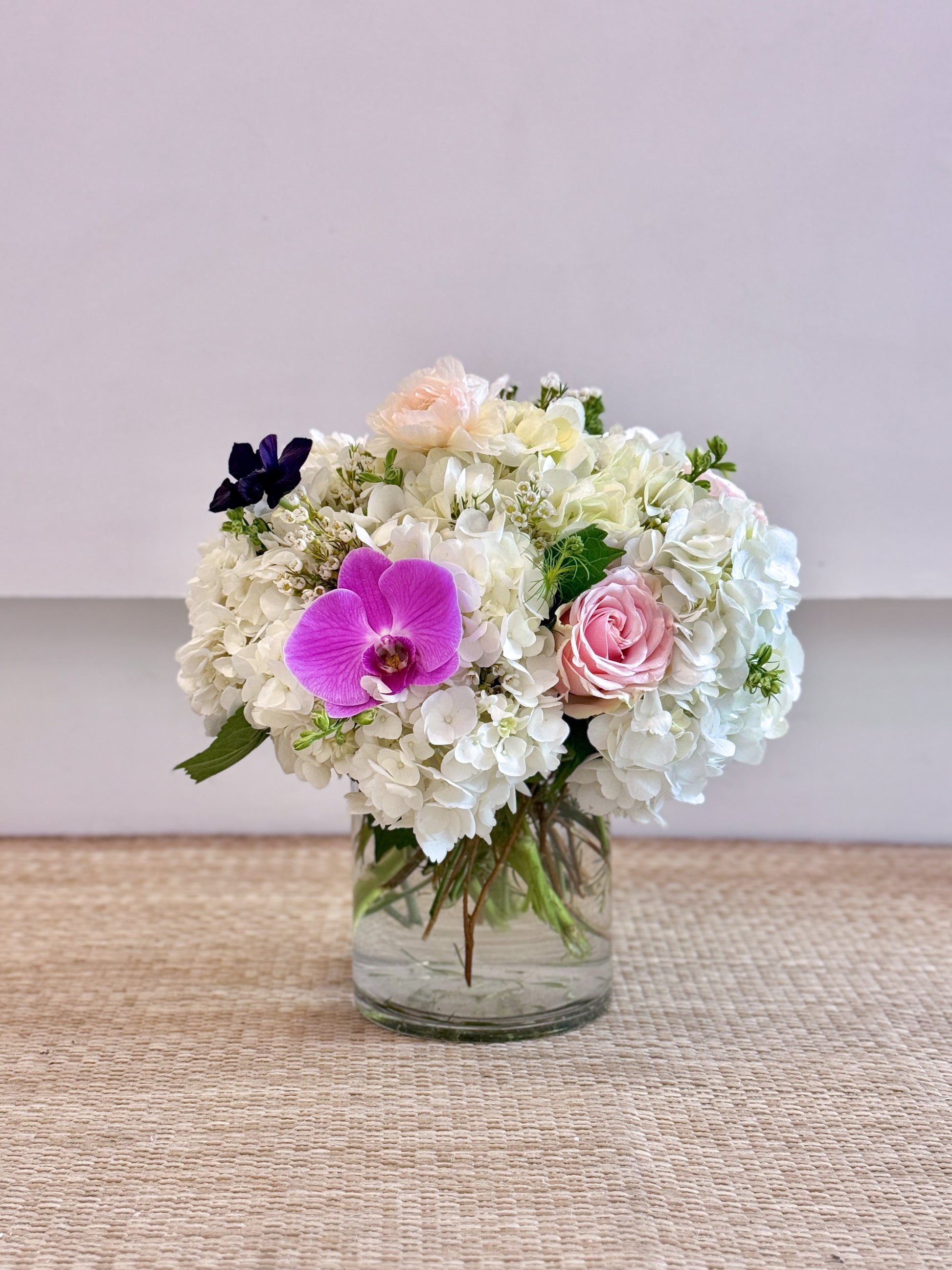 Hampton Dulcet es un arreglo delicado y elegante inspirado en la tranquilidad y el lujo de los Hamptons. Exuberantes hortensias se combinan con dos delicados tallos de orquídea que aportan luz y vida, mientras que rosas rosa pálido, ranúnculos y delicadas flores de relleno crean una atmósfera cálida y romántica.