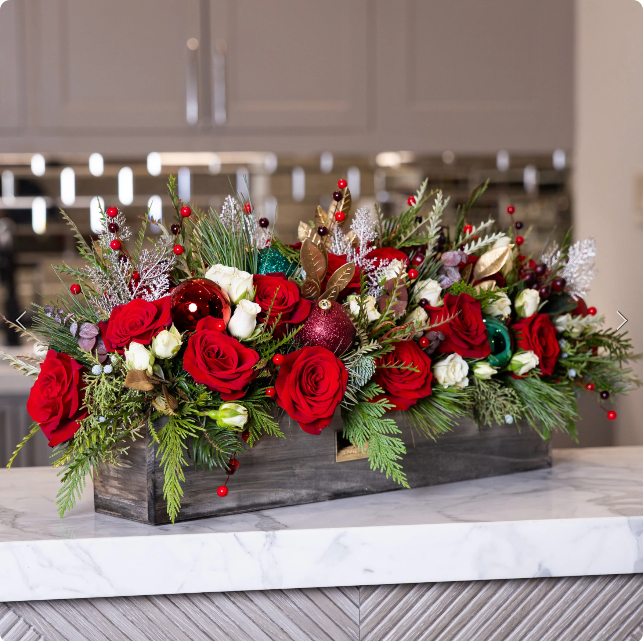 Lleve la magia de las fiestas a su mesa con este lujoso centro de mesa de temporada. Diseñado en nuestra exclusiva caja rústica de madera, este arreglo incluye rosas rojas de primera calidad , rosas en spray color marfil , fragante follaje navideño y elegantes detalles festivos como adornos, bayas, texturas de pino y toques metálicos .