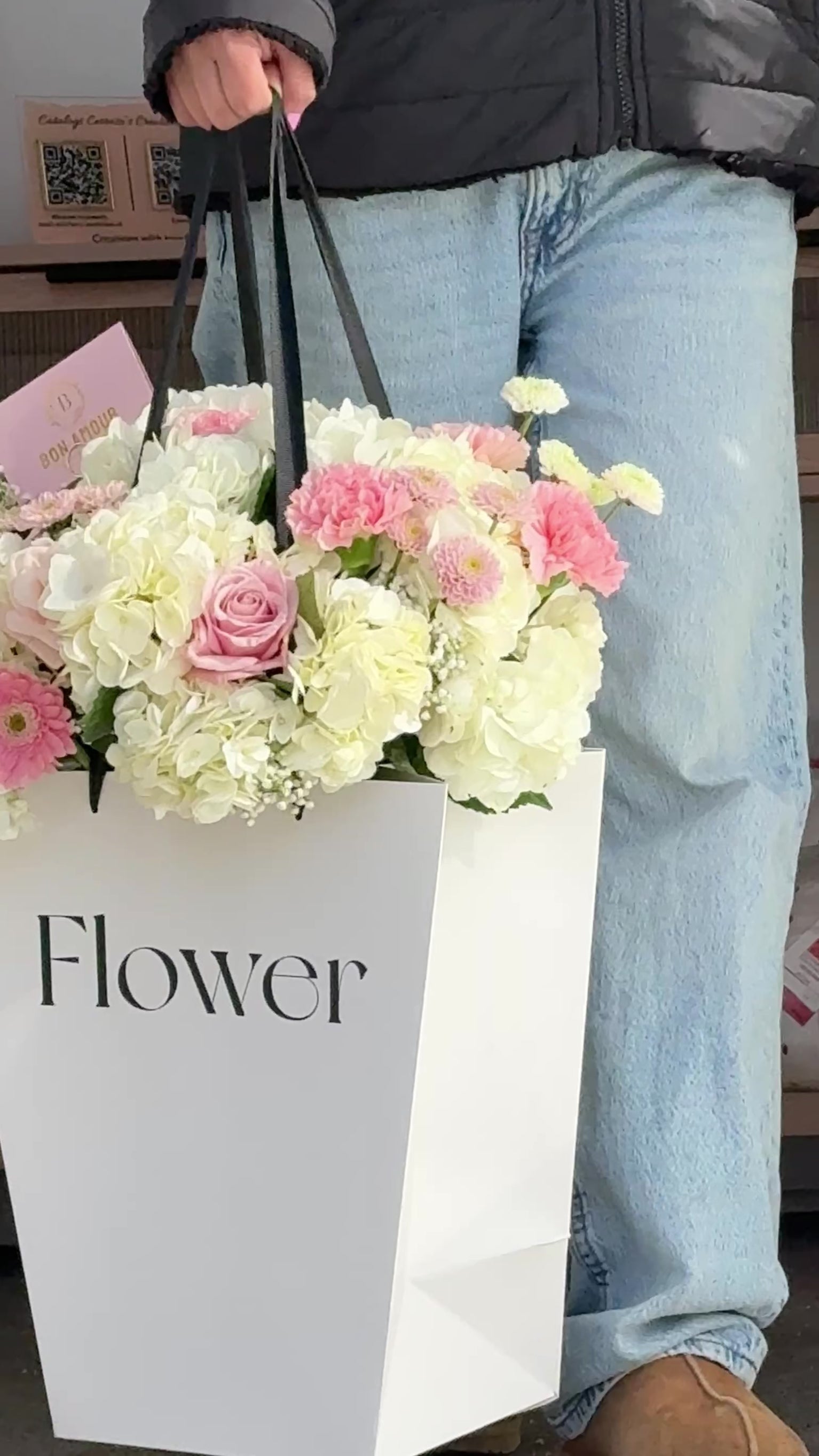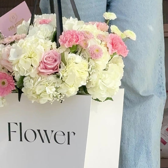 This elegant floral bag arrangement features a