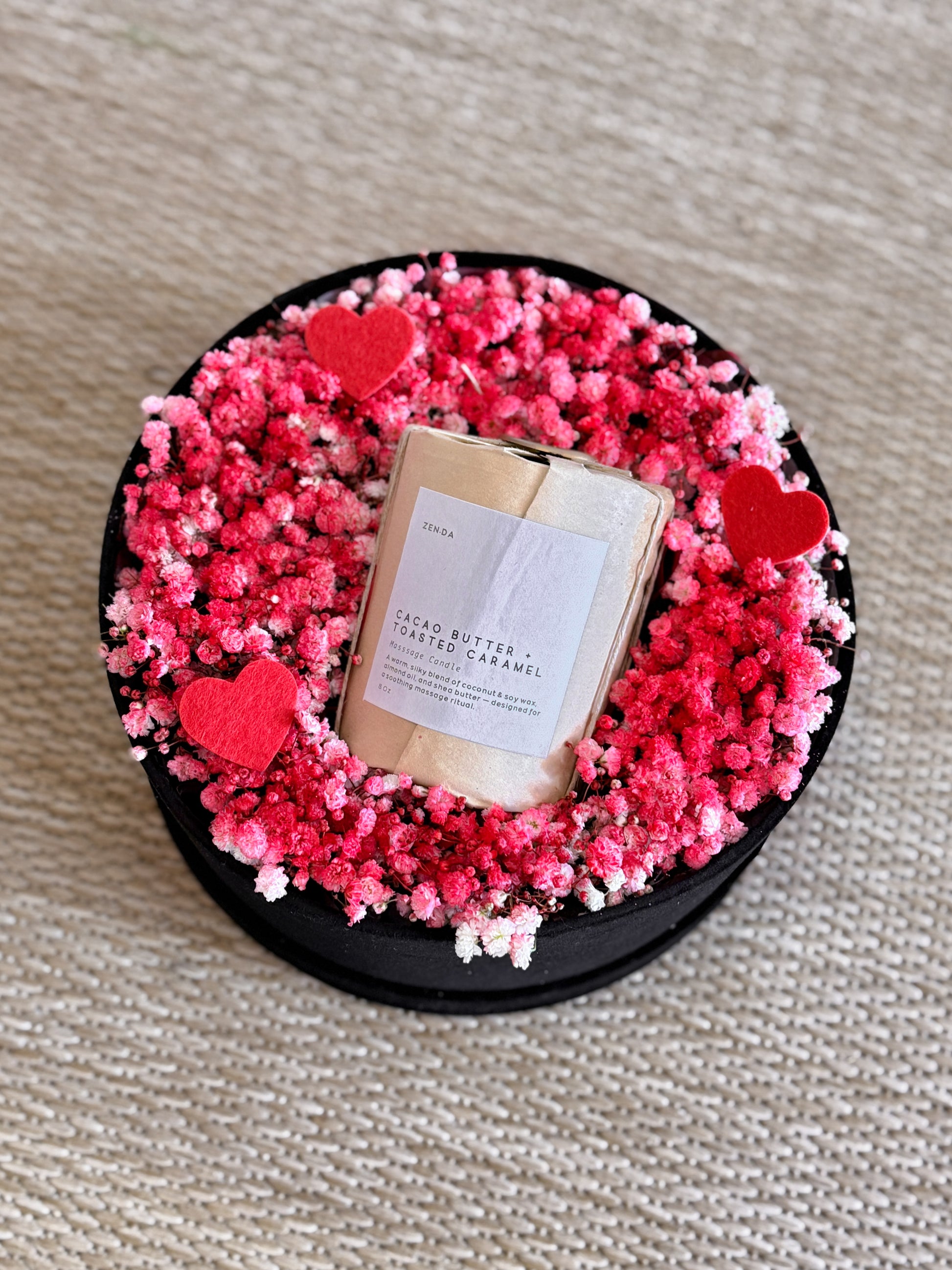 A delicate and romantic arrangement designed to awaken the senses. Cœur Sucré features red fresh baby breath accented with soft heart details, surrounding a luxurious cacao butter & toasted caramel massage candle. Presented in a sleek round box, this piece blends warmth, sweetness—perfect for expressing love in a subtle yet unforgettable way.