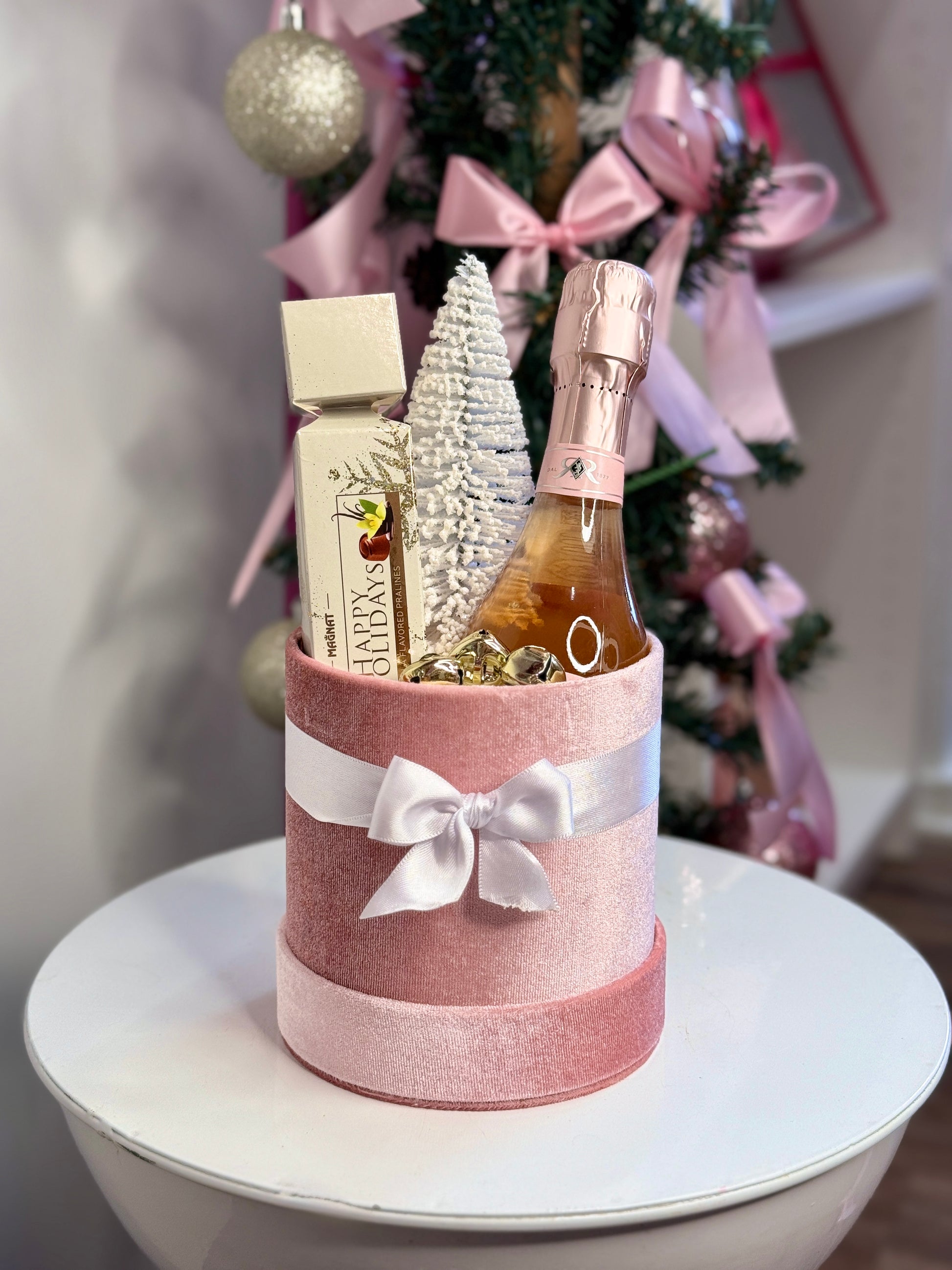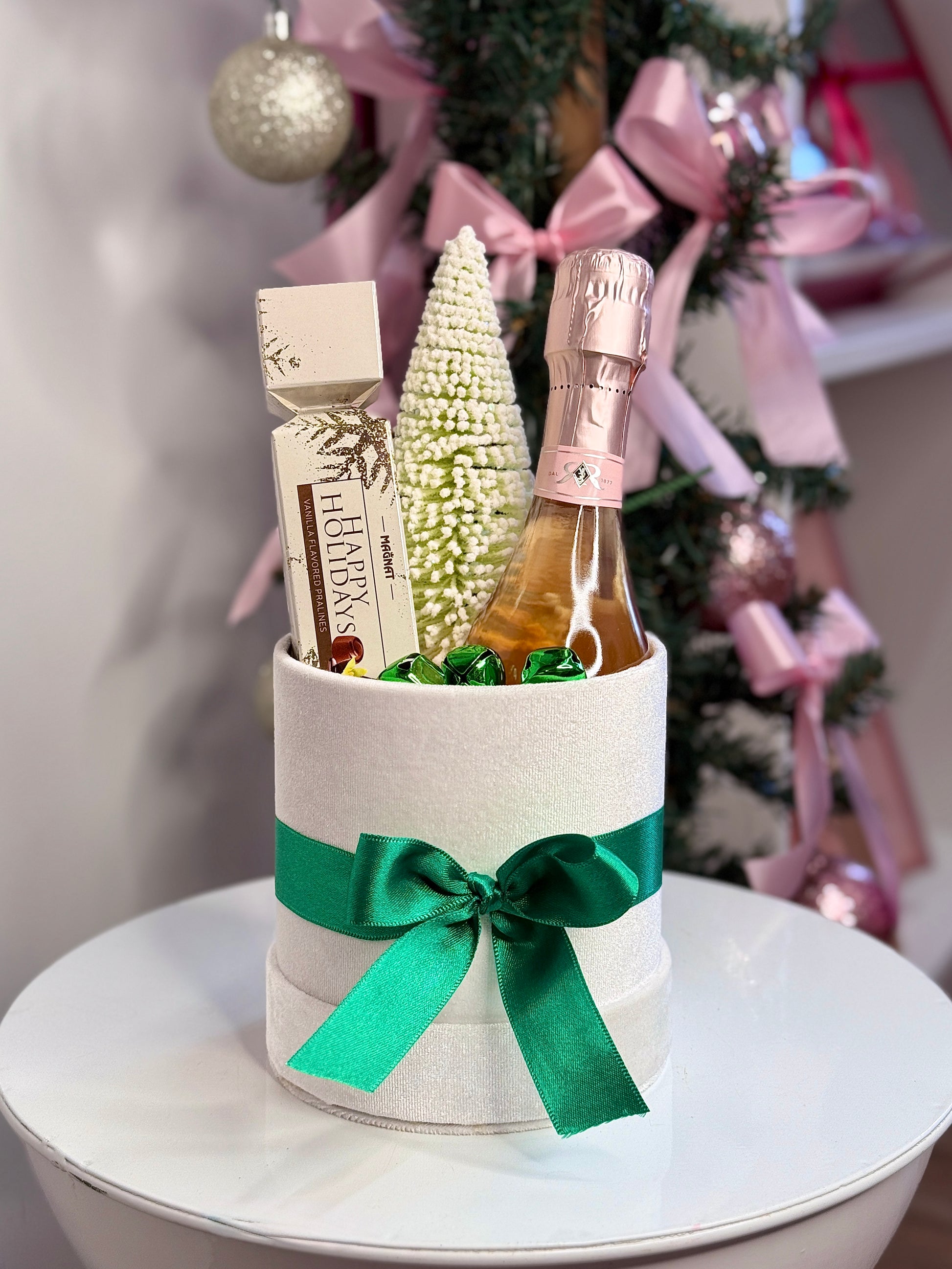An elegant complement to your holiday celebrations. This arrangement is Presented in our signature small bases, with festive accents it includes premium chocolates paired with a 75ml bottle of fine spirits, creating a luxurious and unforgettable gift.