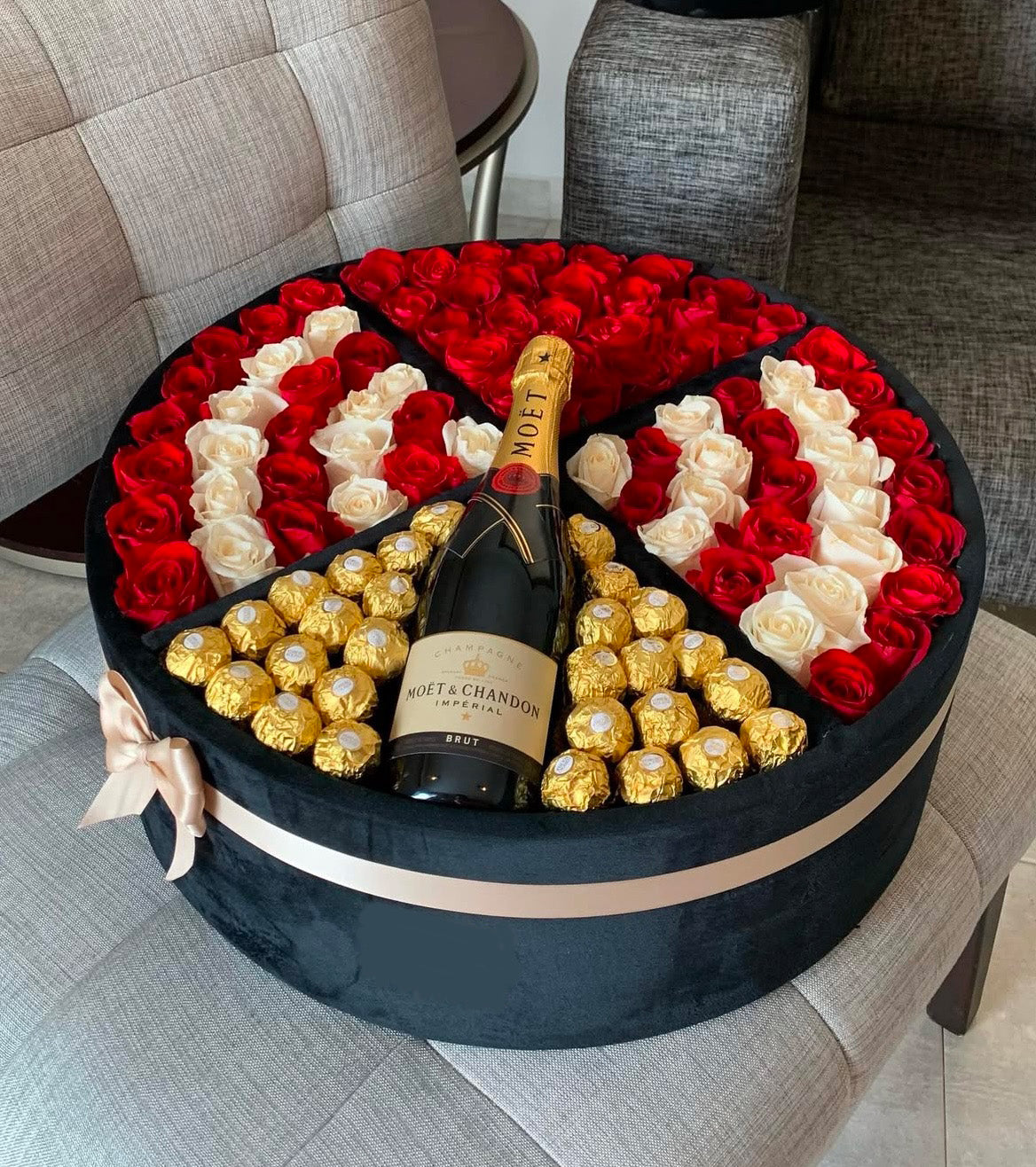 One of our largest arrangement, featuring a set of Ferrero Rocher and a combination of Natural red and white roses placed in a premium quality satin black box, topped with a Moet Imperial 750 ml.