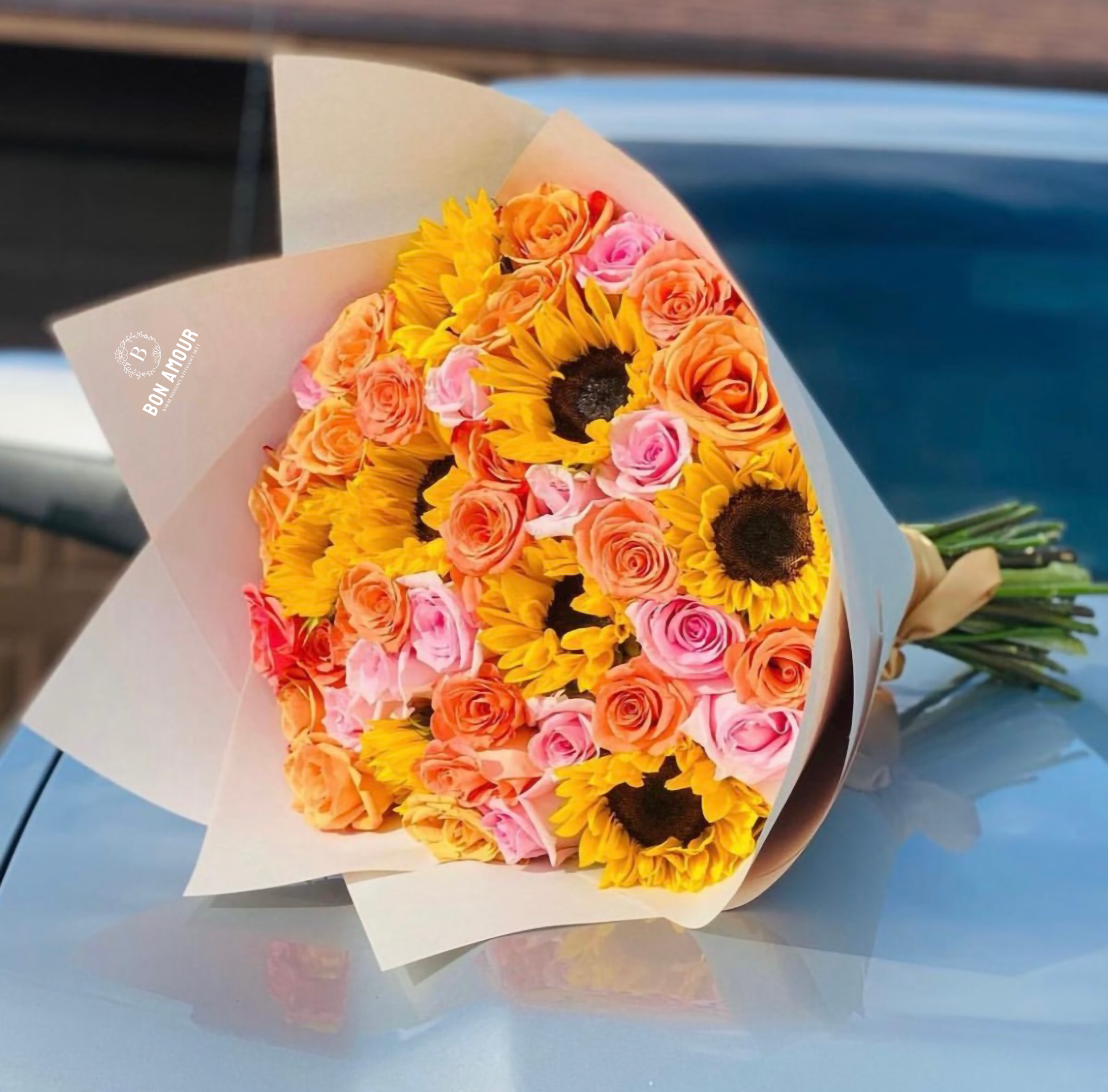 Elevate Mother's Day gifting with our radiant bouquet, marrying the golden cheer of sunflowers with the captivating allure of orange roses